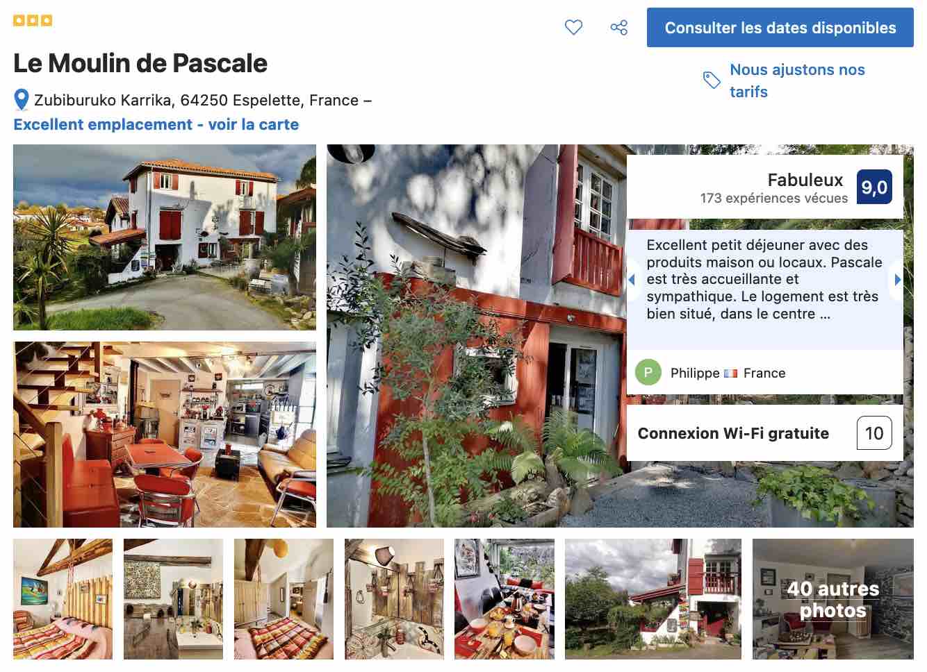 Si vous êtes davantage attirés par le charme d’une maison d’hôtes, je vous recommande le Moulin de Pascale qui se situe également en plein cœur du village d’Espelette.