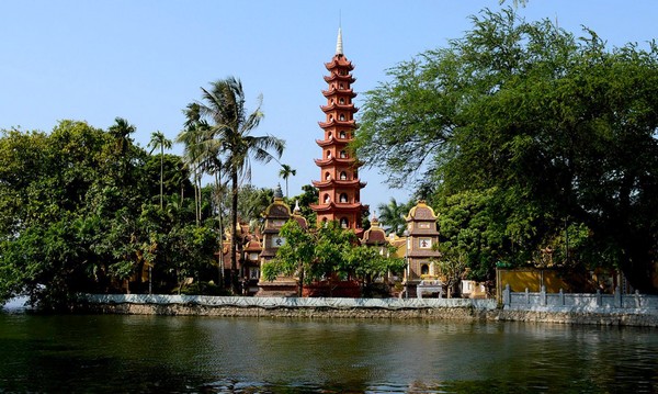 La pagode Tran Quoc, érigée en 541 sur un îlot au bord du lac de l’Ouest (le grand lac). C’est une des plus anciennes pagodes du Vietnam. À l’intérieur, vous avez une statue du Bouddha au Nirvana, l’un des chefs-d’œuvre de la sculpture vietnamienne.