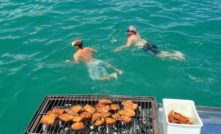 Le midi, le barbecue est préparé par les membres de l’équipage dans la bonne humeur, avec un peu de musique créole ou séga pour mettre l’ambiance.