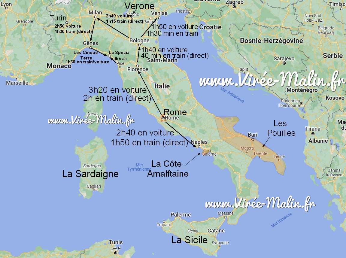 Mais pour commencer, voilà une carte des régions Italiennes (La Vénitie avec Venise, Vérone et le lac de Garde, la Lombardie avec Milan, le lac de Côme et Majeur, la Ligurie avec Gênes et les Cinque Terre, la Toscane avec Florence, Pise et Sienne, la région du Latium avec Rome, la Campanie avec Naples et sa côte Amalfitaine, la région des Pouilles, la Sardaigne, la Sicile).