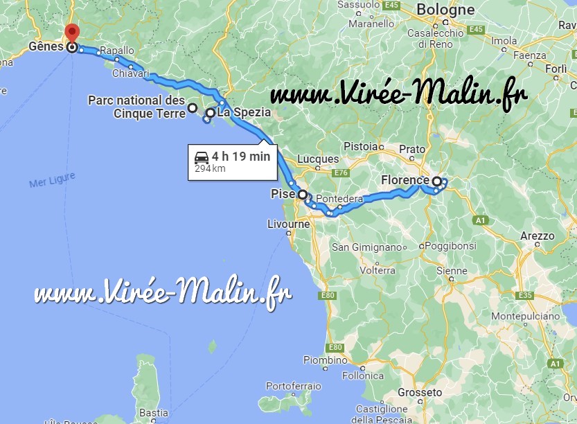 Un joli circuit à suivre serait d’arriver à l’aéroport de Gênes et y dormir une ou deux nuits, puis visiter les Cinques Terres pendant 4 ou 5 jours, puis visiter Florence en 3 ou 4 jours.
