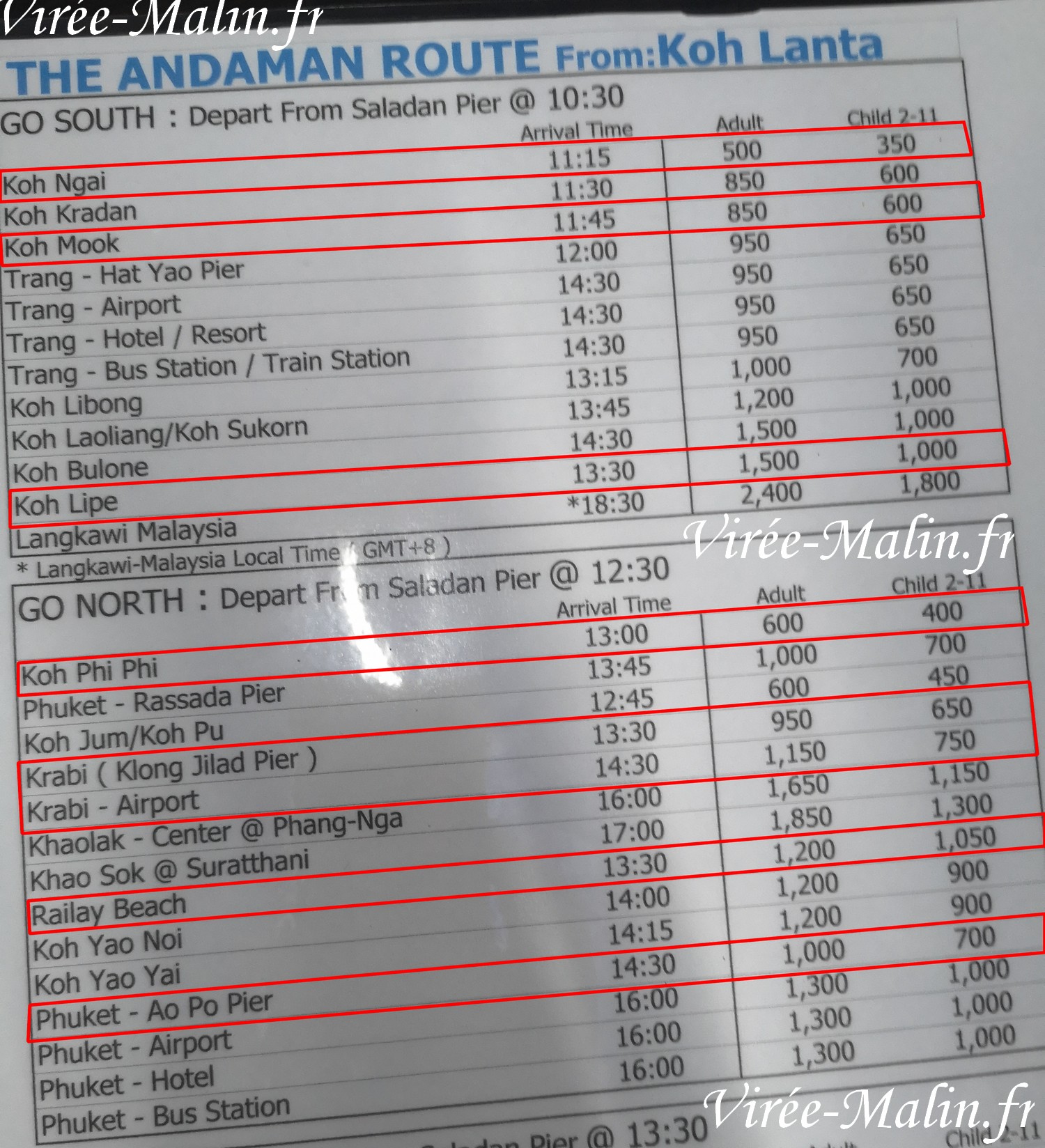 Nous allons à koh lanta en voiture depuis l’ isaan à 5 personnes. Vous connaissez le prix du car ferry depuis krabi, si oui merci de me l’indiquer, ça doit être entre 1000 et 1500 baths pour véhicule + par personne, mais pas sûr ce prix à l’estime. A kho lanta yaï nous allons à l’hôtel Lanta just come, vu video sur yt c’est superbe et pas cher, 1690 baths la semaine pour 1 chambre double ou 250 baths la nuit, ya des chambres pour 4 et 6 personnes c entre long beach et relax bay. Merci pour les plans pour kho rok et koh phiphi où nous irons 1 journée dans chacune. Cordialement.
