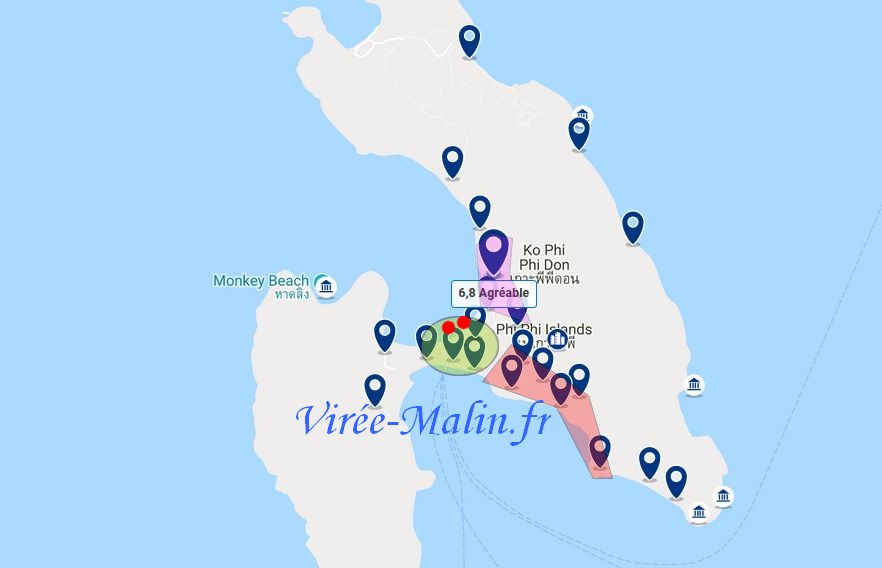 Ne séjournez pas à Tonsai (entre la grande plage et le port, la zone verte), c’est très touristique, donc très bruyant. Les deux points rouges sur l’HotelMap ci-dessous, représentent les deux grosses boites de Koh Phi Phi. Elles font face à la plage donc si votre hôtel est à côté (zone verte) ou fait face à ces deux établissements, vous entendrez la musique.