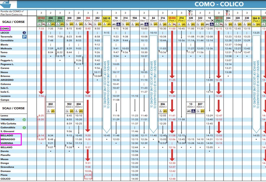 Par exemple, dans l’encadré vert, on peut voir qu’il y a un bateau qui passe à Menaggio à 10h10 et qui va directement à Bellagio en arrivant à 10h30, puis il part directement à Villa Carlotta sans s’arrêter à S.Giovanni et Cadenabbia.