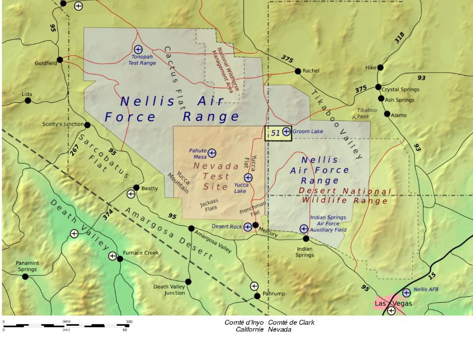 Voilà où se trouve la Zone 51. Attention à ne pas franchir les barrières de sécurité de cette zone (et cela même avec un drone…), c’est strictement interdit (voir la zone au milieu de cette carte, la zone bleue et orange).