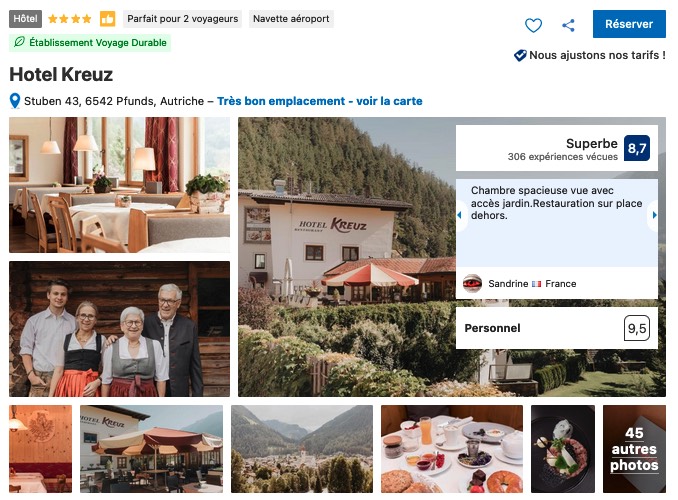 Une chance d’avoir trouvé cet établissement sur notre route, notamment au regard de la qualité de ses prestations hôtelières. Mais également par son restaurant traditionnel qui m’a permis de découvrir d’authentiques recettes culinaires tyroliennes comme le bouillon aux crêpes ou le pavé de cerf de chasse.