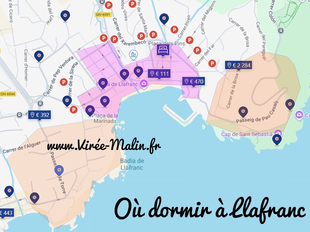 Avant de vous deux adresses, voilà une carte que j’ai personnalisée pour vous et qui vous permet de voir où trouver votre logement à Llafranc. Je vous ai mis en violet la zone où chercher votre logement, et en orange la zone que je ne conseille pas car ça grimpe pas mal…