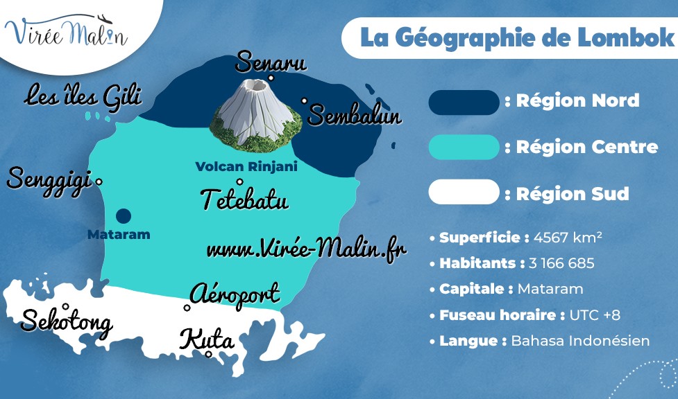 Voiçi une première carte qui vous permettra d’avoir une vue d’ensemble des villes, îles, régions et villages incontournables de Lombok :