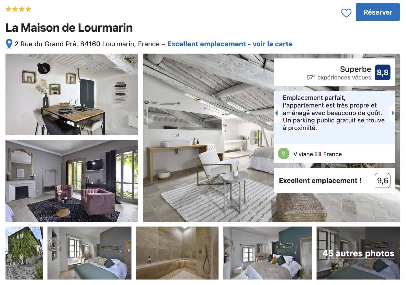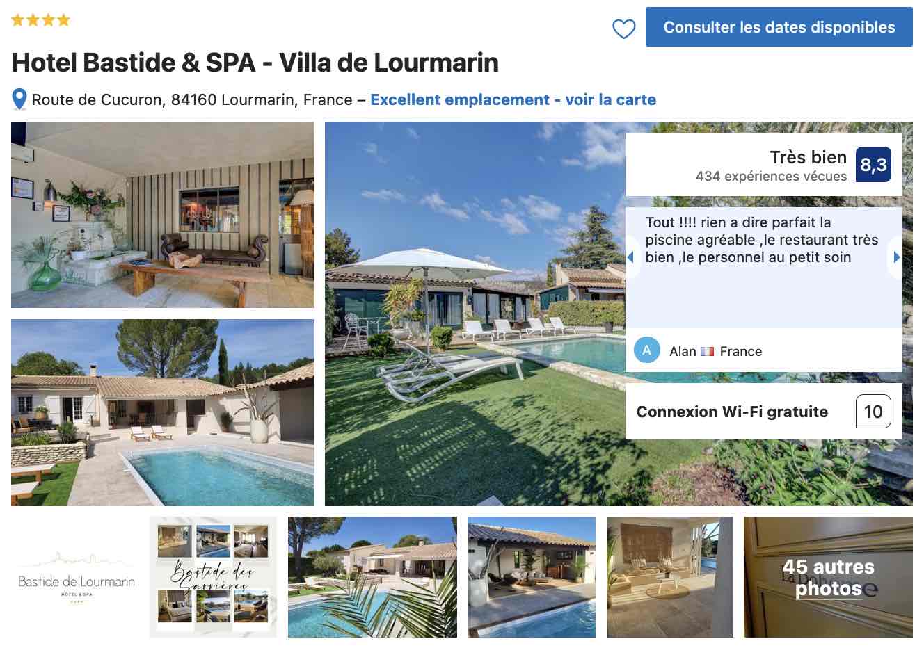 Enfin, pour un séjour plus classe et donc un peu plus cher, idéal pour une escapade romantique ou des vacances en couple, je vous recommande l‘hôtel Bastide & Spa situé à seulement 200 mètres du cœur du village de Lourmarin. Piscine extérieure chauffée, spa, hammam, tables de massage, cadre verdoyant, terrasse privative et prestations haut de gamme : voici ce qui vous attend si vous réservez dans cet établissement.