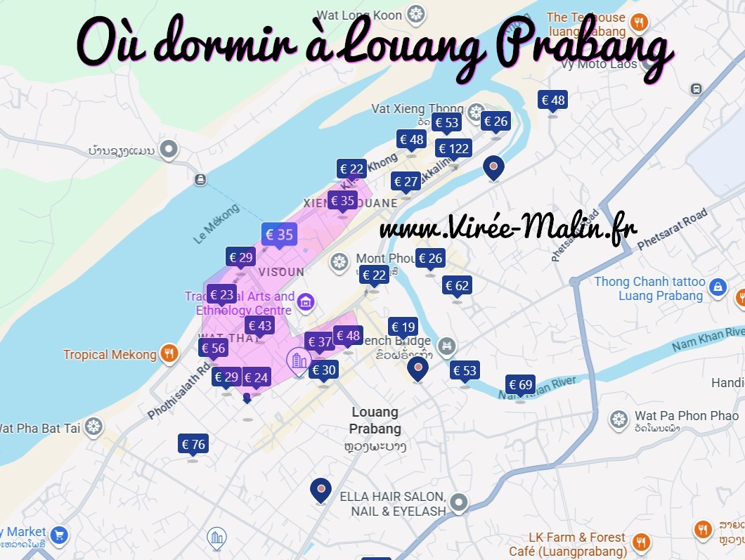Sans hésiter, je vous conseille de dormir au minimum 2 nuits à Luang Prabang et si vous le pouvez je vous conseille même 4 nuits, mais dormir 2 ou 3 nuits à Luang Prabang ça sera déjà très bien! Pour trouver où loger à Luang Prabang c’est dans la zone violette que je vous conseille de chercher, vous serez ainsi idéalement placé pour visiter Luang Prabang à pied mais aussi pour sortir le soir sans devoir prendre les transports.