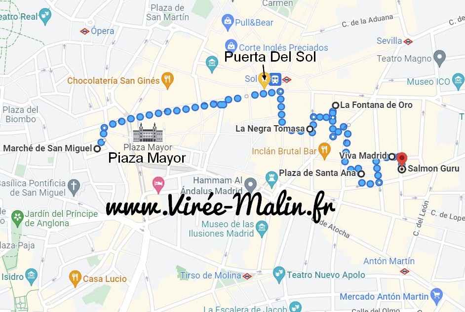 Voilà un guide GoogleMap que j’ai personnalisé afin que vous puissiez avoir une vue d’ensemble de la ville. Comme vous pouvez le voir, la Plaza/Puerta Del Sol est le centre névralgique de la ville, vous verrez que toutes les rues mènent à cette place qui entre nous n’est pas spécialement jolie comparée à l’incroyable Plaza Major!
