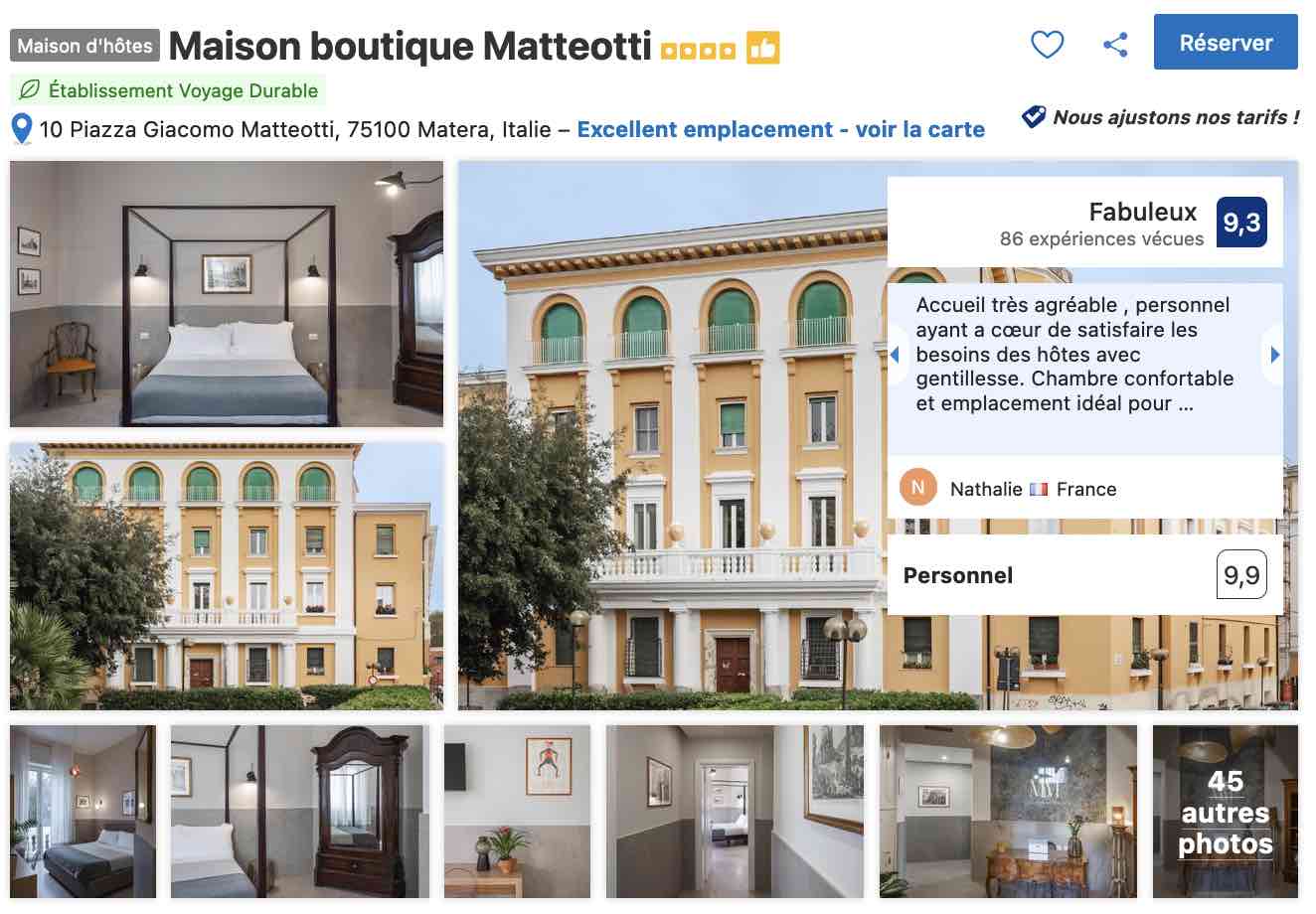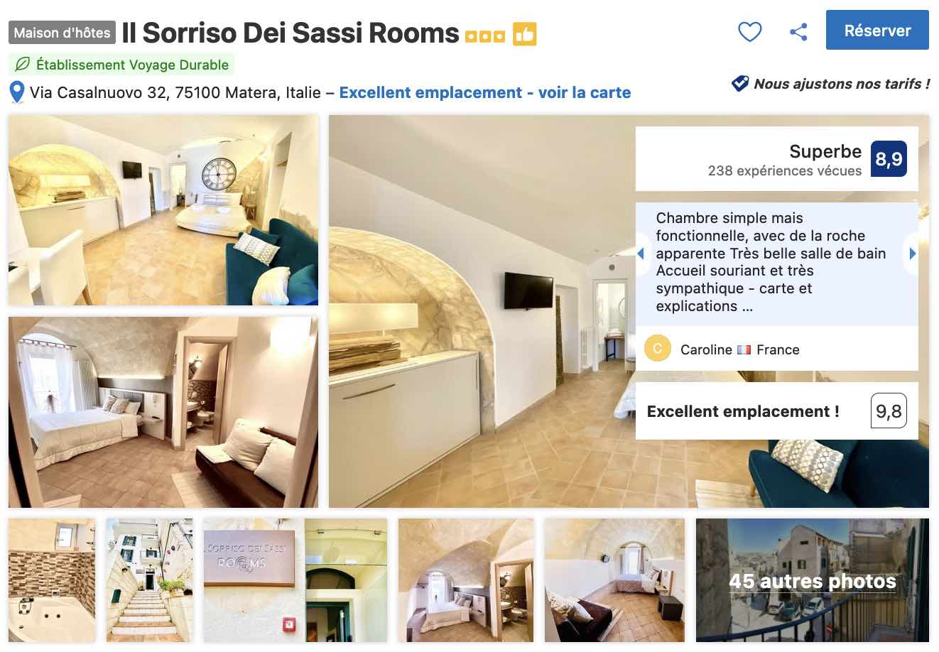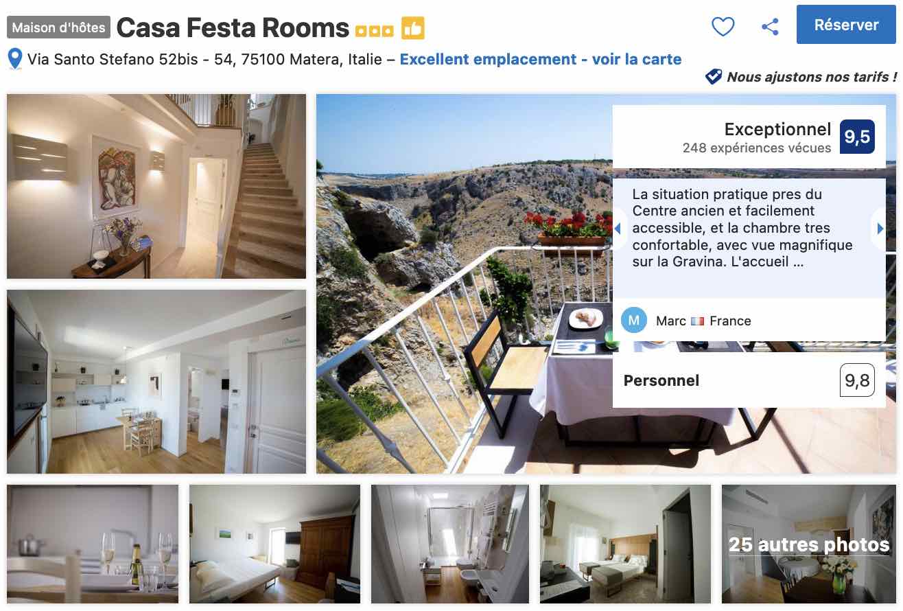 Je vous propose de découvrir quelques adresses pour dormir à Matera avec une solution de parking, dans une gamme de confort médiane et des tarifs raisonnables. Bien évidemment, comme pour tout voyage quelle que soit la destination, anticiper et réserver le plus tôt possible permet souvent de s’assurer une plus grande disponibilité et des tarifs plus compétitifs.