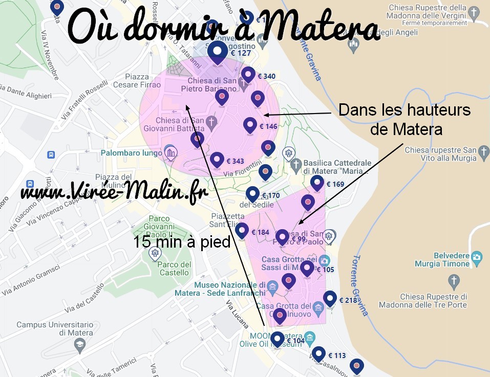 - Cliquez ici pour voir les logements dans les zones violettes que je vous conseille à Matera, vous serez idéalement placé pour visiter Matera mais aussi pour sortir le soir au restaurant à pied: