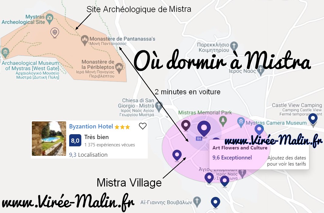 Si l’affluence vous empêche de trouver des disponibilités de logement dans le « centre » de Mistra, je vous incite à choisir un hébergement dans la ville de Sparte distante de cinq petits kilomètres. Vous y trouverez les hôtels confortables et pas cher tout en restant très proche de Mistra.