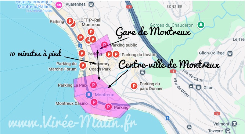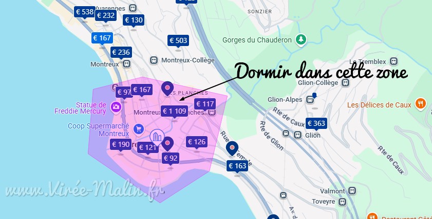 Montreux est vraiment une petite ville bucolique et très agréable pour séjourner. Néanmoins, il n’y a pas plusieurs quartiers où loger pour être dans le centre de Montreux et profiter de ses bars et restaurants. Aussi, pour vous loger à Montreux, la zone principale que je vous conseil est la zone violette sur la carte ci-dessous.