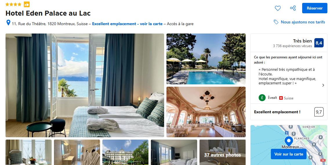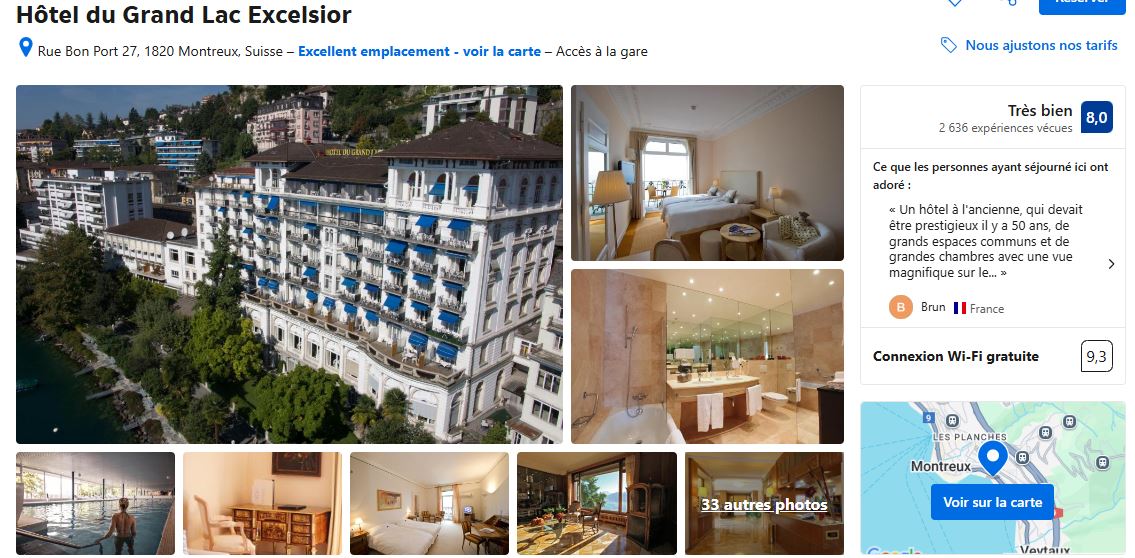 - Pour finir, afin que vous ayez plusieurs options car les logements partent très vite à Montreux compte tenu du nombre d’évènements artistiques et musicaux qui s’y déroulent, je vous conseil l’Hôtel du Grand Lax Excelsior.