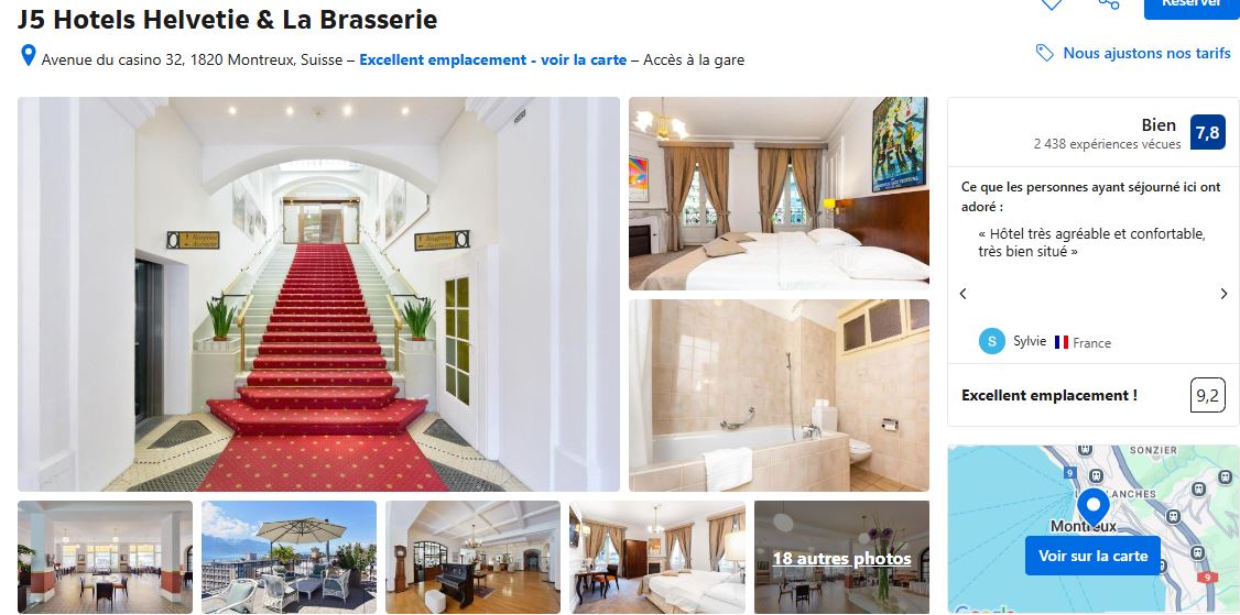 - En second lieu, je vous conseil l’Hotels Helvetie & La Brasserie également dans la zone que je vous ai montré précédement. Semblablement très bien placé, et avec des tarifs un peu plus concurrentiels que l’hôtel Eden Palace cité précedemment.