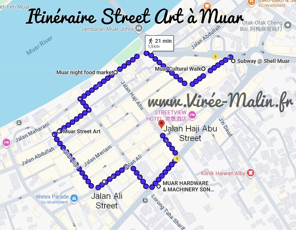 Je vous ai concocté un petit itinéraire à pied pour bien visiter les principales rues de street art de Muar. Ne le suivez pas forcément à la lettre mais ça vous donnera déjà une belle idée de où commencer et de où se situent les œuvres.