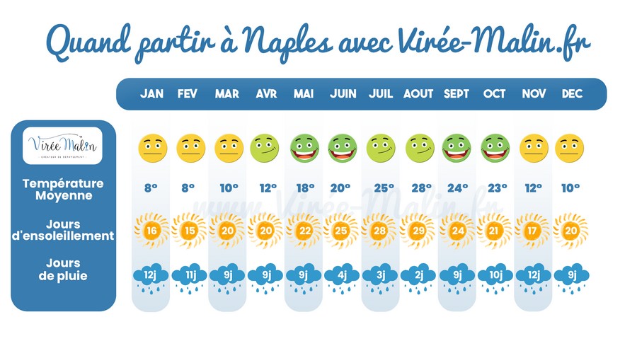 Un dernier petit point météo pour vous montrer que Naples à un climat très agréable. Evitez quand même les mois de Janvier et Fevrier qui sont les deux mois les moins favorables pour la visiter mais sinon, même au mois de Décembre vous pouvez voir que les températures sont clémentes.