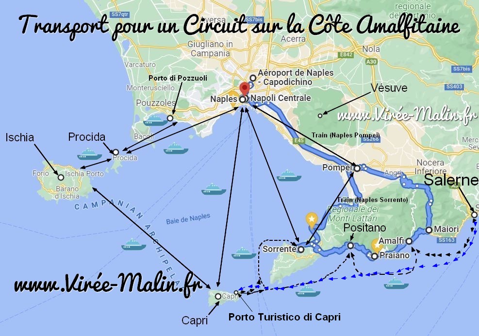 Je viens de vous envoyer le guide. Pour se rendre à Positano depuis Naples vous avez le taxi (c’est cher) ou le bus. Après vous pouvez aussi utiliser le train depuis la gare de Naples vers Sorrento (lien googlemap) puis vous prendrez un bus ou taxi !