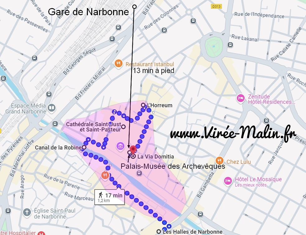 Pour visiter Narbonne à pied et pouvoir profiter pleinement de vos soirées, je vous recommande de choisir votre hébergement dans le cœur historique de la ville, dans la zone sud proche de la Cathédrale Saint-Just-et-Saint-Pasteur, c’est à dire dans la zone violette sur cette carte que j’ai personnalisé pour vous. Vous serez idéalement placé pour visiter la ville mais aussi pour sortir le soir sans devoir prendre les transports.