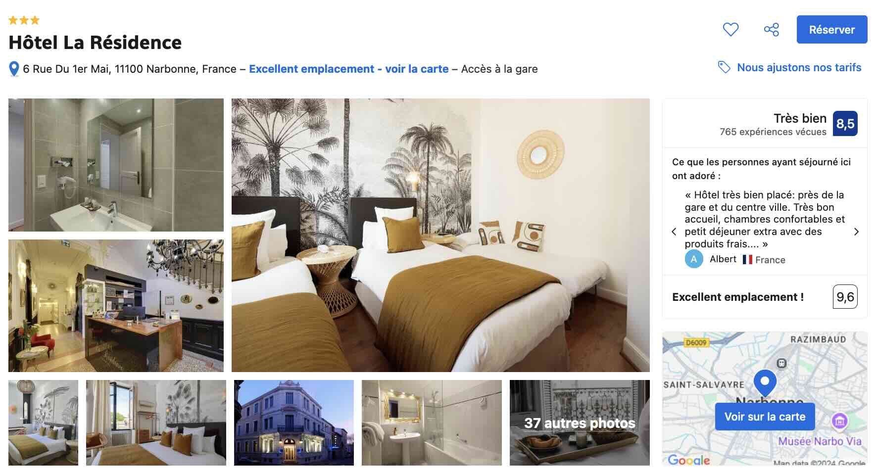 Un peu plus cher, mais situé juste à côté de la Cathédrale et proposant des prestations plus classe, vous avez aussi l’hôtel La Résidence. L’établissement est installé dans un ancien bâtiment du 14ème siècle à 50 mètres du canal de la Robine. L’hôtel met l’accent sur les produits locaux et le savoir-faire de la région, ce qui rend le séjour plus authentique encore. Vous trouvez également de nombreux bars et restaurants tout autour du logement.