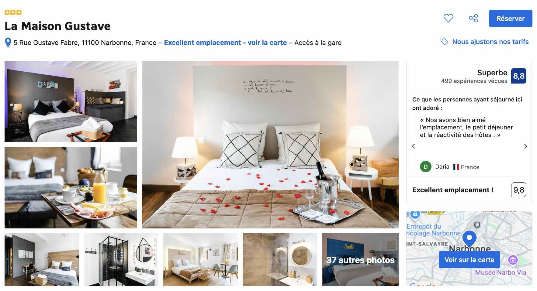 Enfin, pour une nuit en chambre d’hôtes en plein cœur de Narbonne, je vous conseille de réserver à la Maison Gustave qui se situe à deux pas de la Cathédrale et à moins de 5 minutes des principaux centres d’intérêt de la ville ainsi que des bars et restaurants.