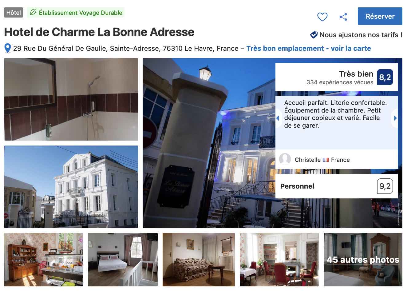 Pour vos nuits au Havre et si vous voulez vivre une expérience différente que les traditionnelles chaînes d’hôtel, je vous recommande l’hôtel de Charme La Bonne Adresse. Cet établissement se situe dans un quartier résidentiel réputé du Havre et construit dans une ancienne maison bourgeoise. D’ici, vous êtes à moins de cinq minutes du front de mer et de la plage de galets ainsi qu’à une dizaine de minutes à pied du centre-ville et des bâtiments classés à l’Unesco.