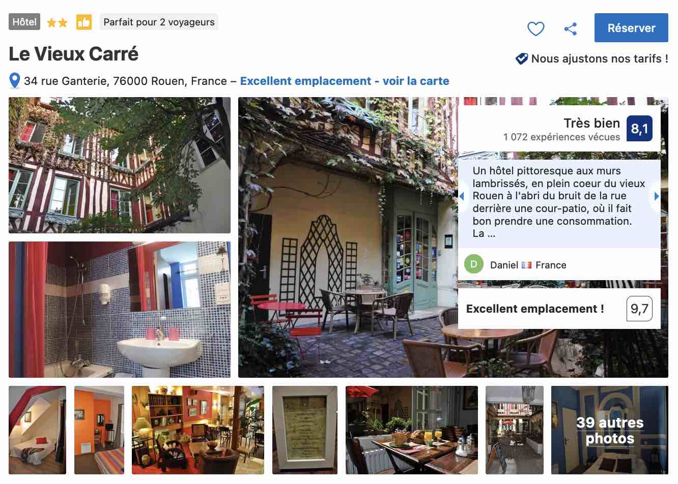 Pour un hébergement à Rouen en plein centre-ville, à proximité de la rue du Gros-Horloge et de la zone piétonne, vous avez l‘hôtel Le Vieux Carré. L’établissement se situe dans un bâtiment à colombages typique de la région. Les prestations y sont haut de gamme pour un tarif raisonnable à partir de 80 euros la nuit pour deux personnes et selon la période choisie.