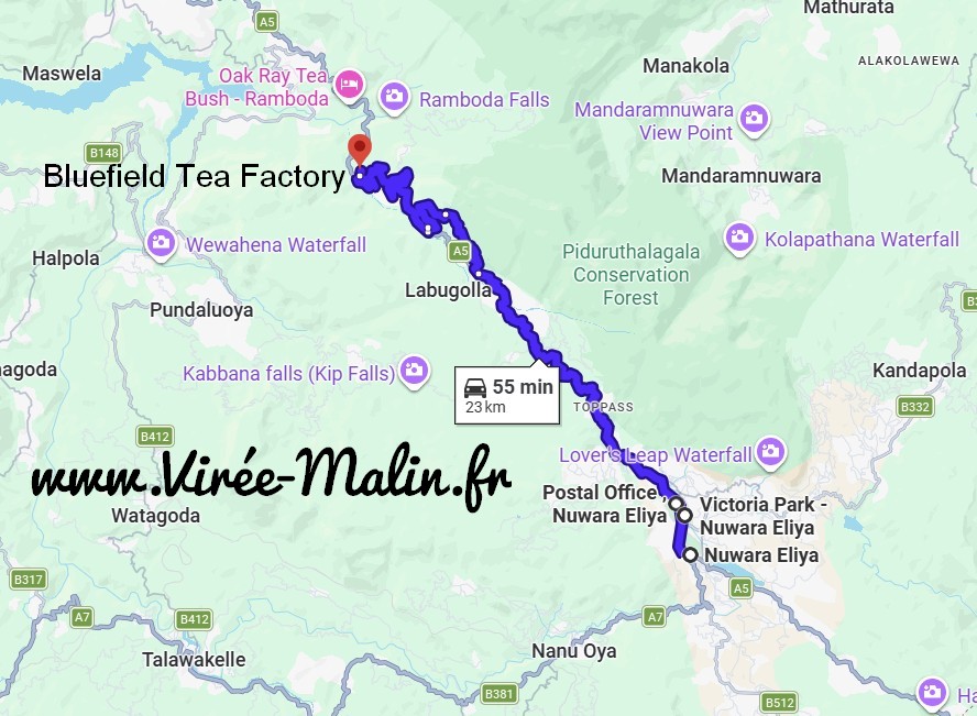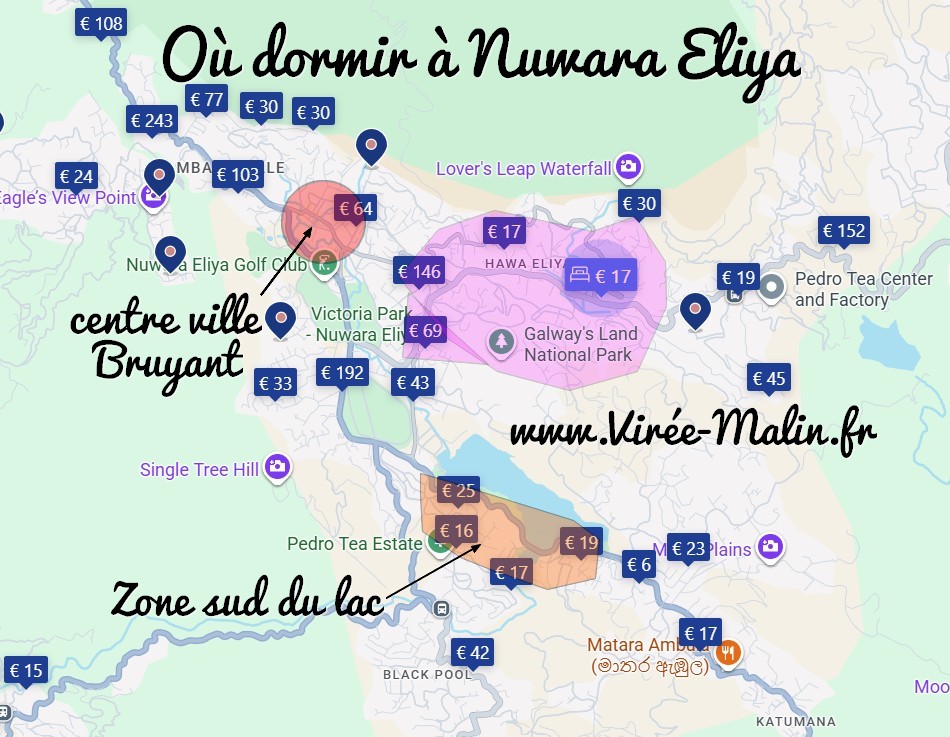 Quoiqu’il en soit, je vous conseille deux zones pour loger à Nuwara Eliya, la zone violette ou la zone orange au sud du lac, et du coup je vous déconseille la zone rouge ‘centre ville’. Cliquez ici pour voir les logements encore disponibles à Nuwara Eliya: