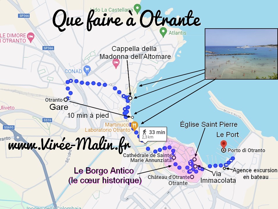 Pour que votre séjour à Otrante soit le plus authentique possible, je vous conseille également de dormir dans le centre-ville qui se situe en bord de mer, entre la chapelle de la Madonne et le port de plaisance. Je vous ai mis en orange la zone où chercher un logement si vous avez une voiture de location, plus facile pour trouver un parking… et qui reste à deux pas du coeur historique de Otrante.