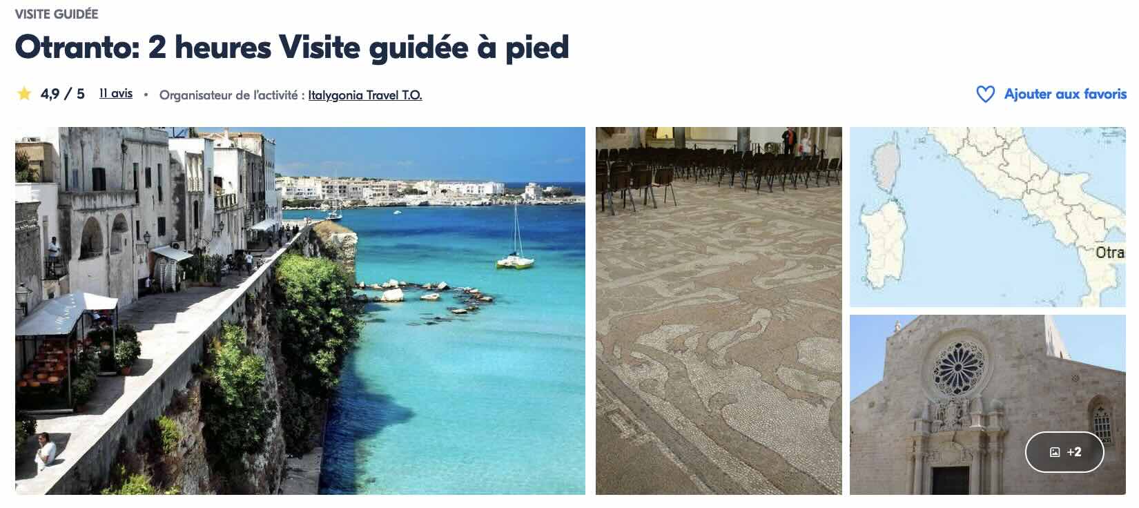 Pour celles et ceux qui souhaitent approfondir leur découverte et profiter d’anecdotes et petites histoires sur Otrante et ses habitants, je vous conseille de réserver cette visite guidée à pied avec guide francophone. C’est, à mon humble avis, le meilleur moyen pour vraiment s’immerger dans la destination et en découvrir les différents trésors.