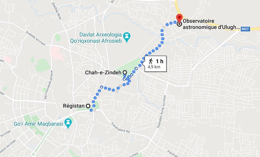 Voyez aussi l’observatoire d’Oulugbek (d’Ulugh Beg) qui est situé à 1km de la nécropole. Vous allez découvrir les rails d’un observatoire construit au 15ième siècle par le petit fils d’Amir Timur à Samarcande. Et en fin de journée, vous pouvez rejoindre la gare en taxi, comme d’habitude vous pouvez demander à votre hôtel de le réserver pour vous.