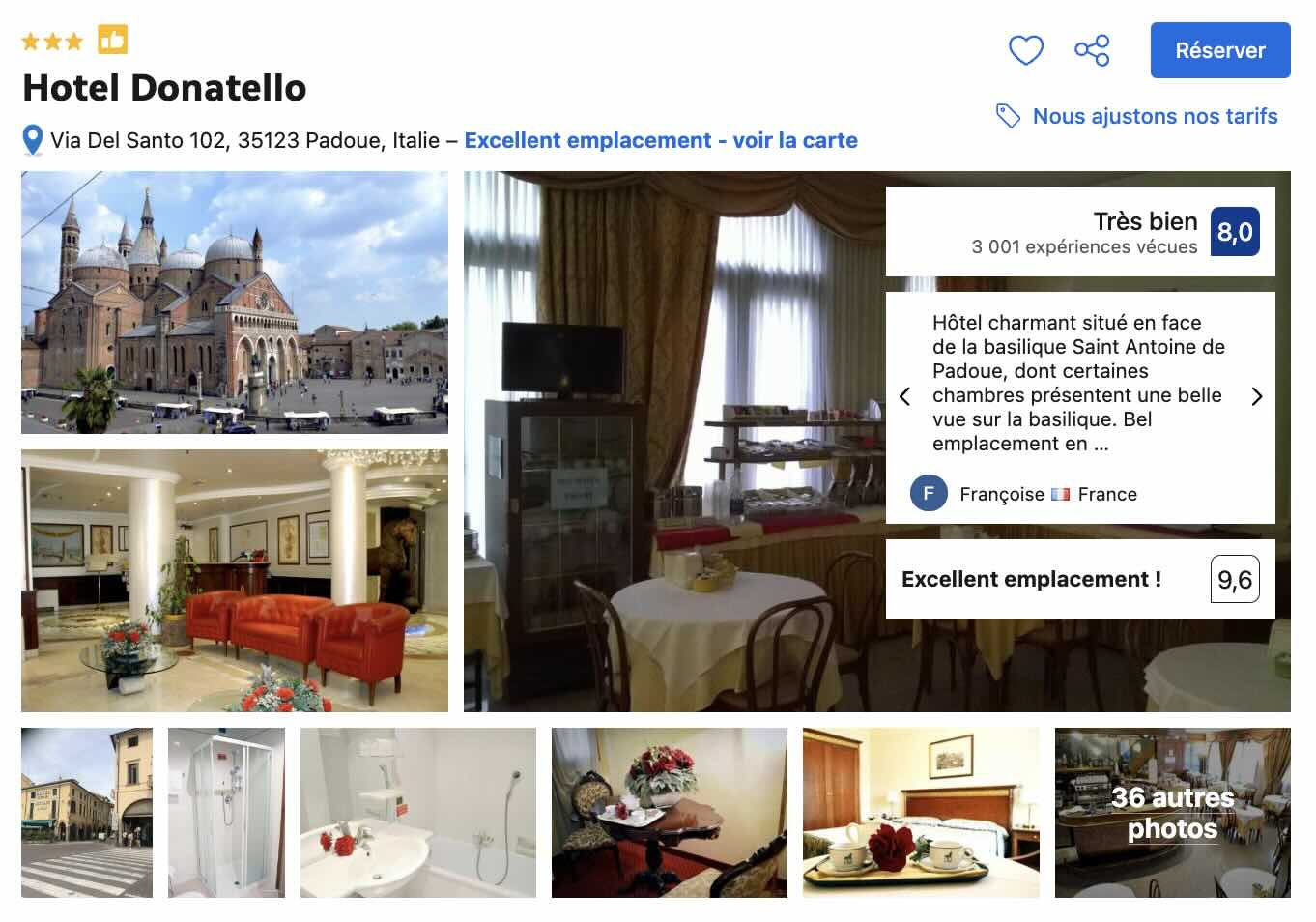 La première adresse que je vous recommande est celle de l’hôtel Donatello qui se situe juste en face de la Basilique Saint Antoine de Padoue. Certaines chambres, moyennant un tarif supplémentaire, vous offrent une vue panoramique sur le monument historique.