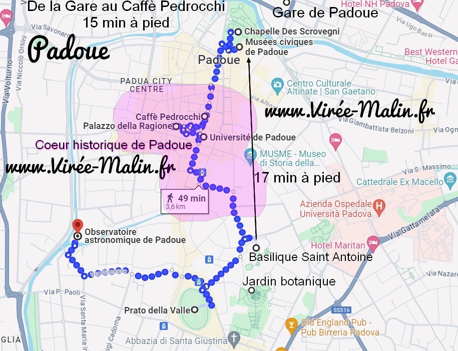 Comme dans mon habitude voilà une carte que j’ai personnalisé pour vous et qui vous permet de voir où se trouvent les incontournables à voir à Padoue. Je vous ai aussi mis, en violet, la zone où chercher votre logement si vous vous posez la question où dormir à Padoue pour visiter la ville à pied mais aussi pour pouvoir être bien placé pour sortir le soir.