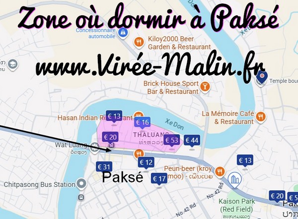 Je vais vous donner 4 adresses et ces 4 adresses de logement à Paksé se trouve dans la zone violette, c’est ici qu’il faut loger à Paksé et pas ailleurs.