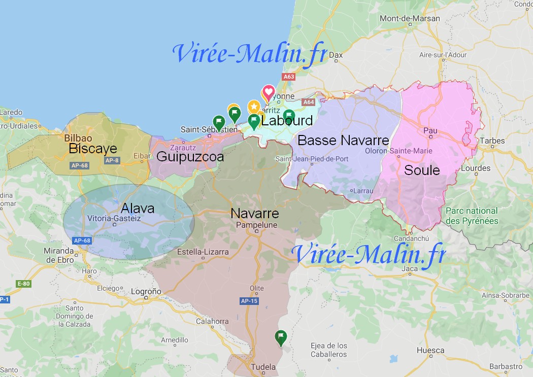 Voilà une carte que j’ai essayé de personnaliser afin de vous montrer les 7 régions du Pays Basque, c’est une carte approximative qui vous permet de différencier les différentes régions du Pays Basque.