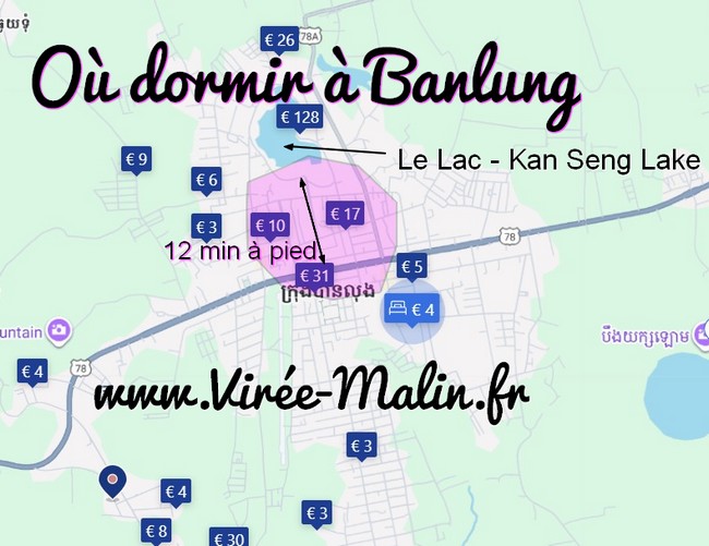 Banlung, la grande ville provinciale, sert de point de chute idéal : tout ou presque se visite à la journée, en étoile, avec un scooter ou un guide local. C’est à Banlung que je vous conseille de loger, plus exactement dans la zone violette sur la carte ci-dessous que j’ai personnalisé pour vous et où vous pouvez aussi voir les incontournables à visiter à Banlung.