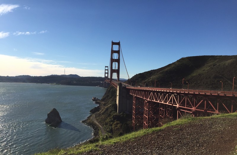 Avant la traversée en voiture, je vous conseille d’admirer la vue imprenable depuis la Marine Drive & Long Avenue (voir le point GoogleMap « Fort Point National Historic Site »). En été comme en hiver, ce lieu de rencontre entre les eaux du Pacifique et de la baie est rarement paisible ! Brumes et bourrasques seront certainement de la partie.