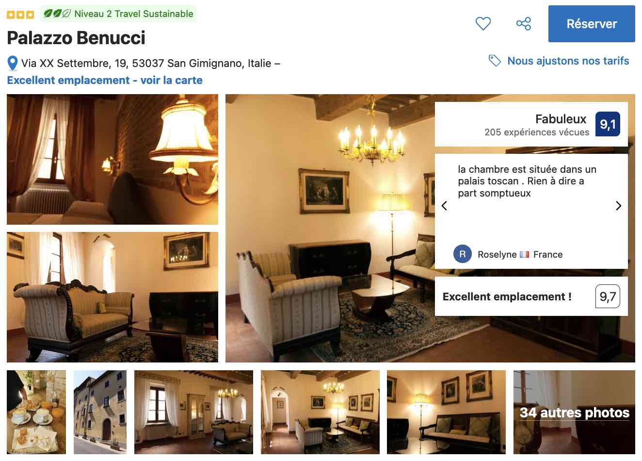 Pour un tarif similaire, avec une situation dans le cœur du village et tout autant de charme dans les chambres, vous pouvez aussi réserver votre séjour à San Gimignano auprès du Palazzo Benucci, une autre maison d’hôtes qui offre des prestations de haute qualité pour un excellent rapport qualité-prix.
