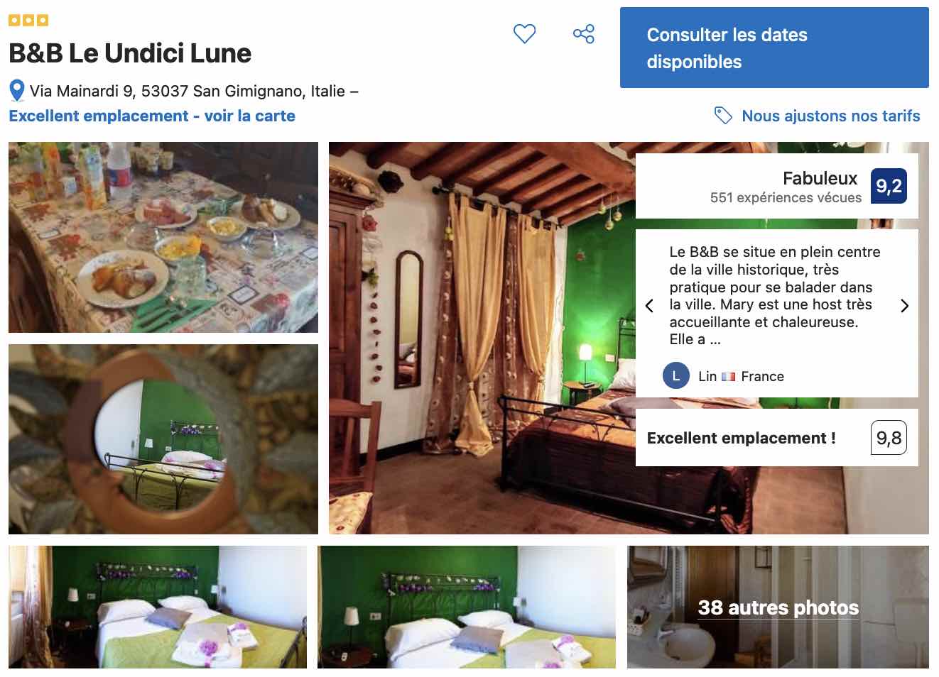 La première adresse où je vous invite à poser vos valises pour un séjour à San Gimignano est celle du B&B Le Undici Lune. Cette maison d’hôtes possède un charme fou en grande partie grâce à sa situation dans un ancien palais du 13ème siècle. Le tarif débute autour d’une centaine d’euros pour une chambre double au cœur du village.