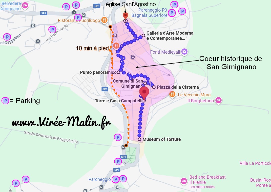 Comme dans mon habitude, voilà une carte que j’ai personnalisé pour vous qui vous permet de voir où se trouvent les sites touristiques incontournables de San Gimignano avec en plus, les parkings pour vous garer, et en violet, la zone que je vous conseille pour dormir à San Gimignano afin d’être idéalement situé et pouvoir sortir le soir au restaurant sans devoir prendre de transport…