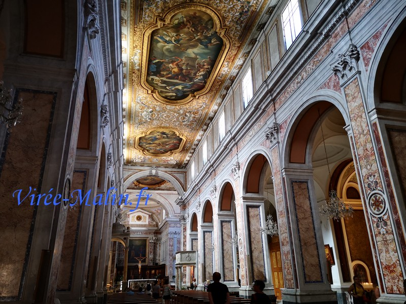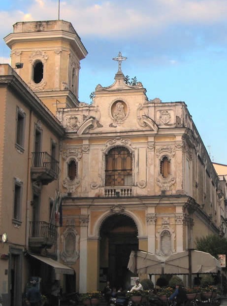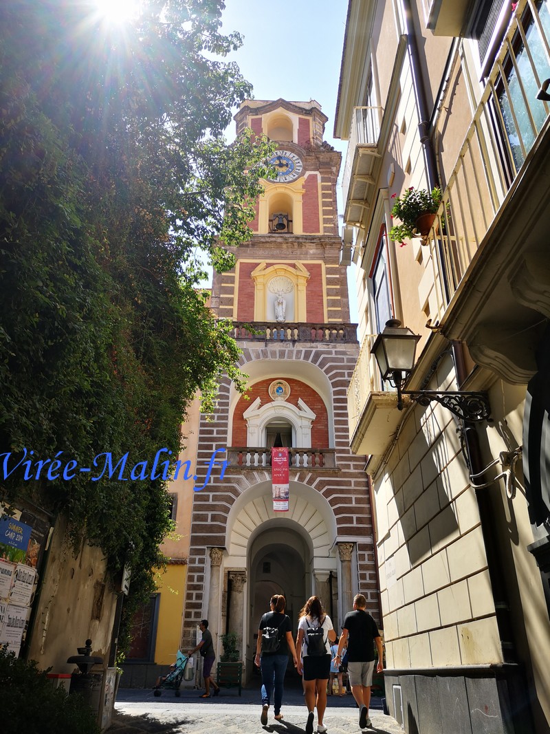 Église romane du 11°S. avec un campanile bizzaroïde et charmant, son horloge en faïence et de très belles marqueteries (la spécialité de Sorrente).