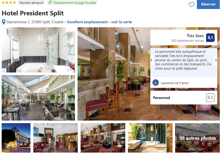 Pour ma part, vu que mon voyage était un road trip en Croatie, j’ai réservé mon logement assez tard et il ne restait que très peu de logements. J’ai quand même pu trouver l’hôtel Président (qui se trouve dans la zone violette). Il se situe à 5 minutes à pied du centre historique de Split, il y a un parking juste en face (7 kunas/heure, ce qui fait 1 €/heure). Un bel atout, si comme moi vous avez loué une voiture en Croatie.