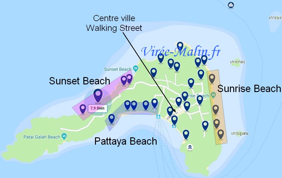Exemple de carte personnalisé que j’ai personnalisé à Koh Lipe avec, à chaque fois, un code couleur pour vous dire pourquoi loger ici et pas ici…