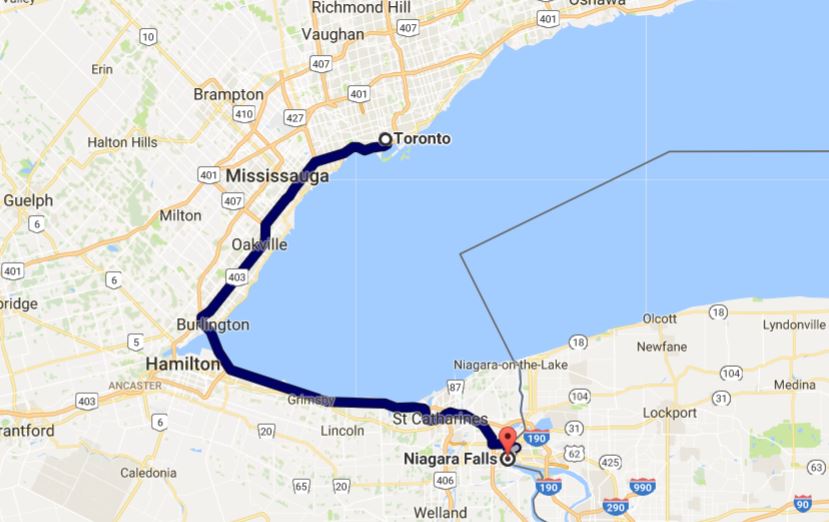 Cliquez ici pour agrandir cette GoogleMap – Rejoindre les chutes du Niagara depuis Toronto :