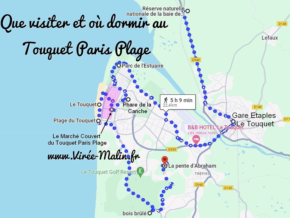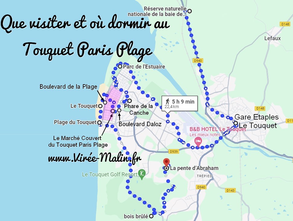 Mais avant cela, voilà une carte que j’ai personnalisé pour vous et qui vous permettra rapidement de voir où se trouvent les sites incontournables du Touquet-Paris-Plage. Je vous ai aussi mis, en violet, la zone idéal pour trouver un logement afin de pouvoir profiter de vos soirées sans devoir prendre de transport en commun…