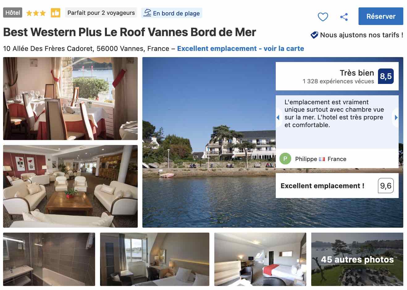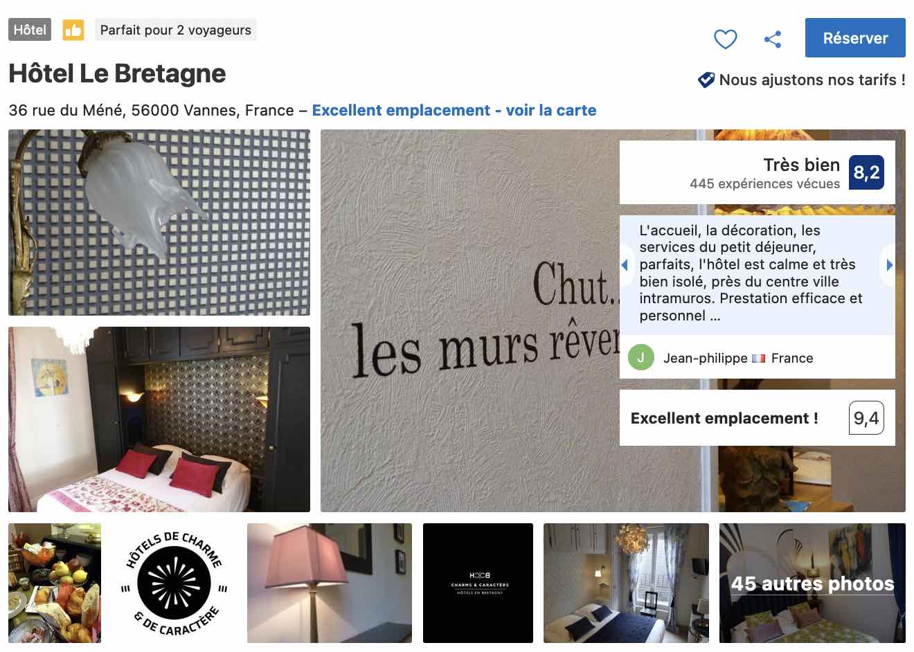 Si l’on en croît les commentaires et avis laissés par les voyageurs ayant fait l’expérience des lieux qui semblent faire l’unanimité, vous trouverez ici une propreté irréprochable, un accueil discret et convivial et des services de qualité pour un séjour tout confort à Vannes à moins d’une centaine d’euros la nuit selon la période.