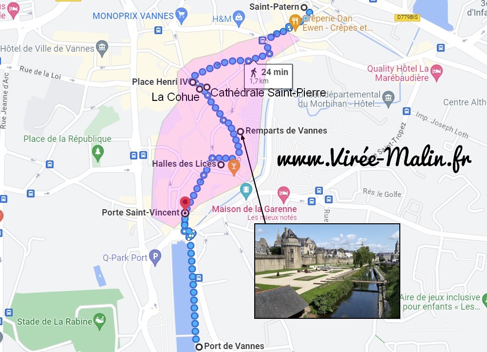 Les activités à Vannes sont nombreuses pour votre séjour en terres bretonnes. Voilà une carte que j’ai personnalisé pour vous et qui vous permet de vous familiariser facilement avec la ville, vous pouvez voir les incontournables que je vais énumérer par la suite et aussi, en violet, la zone où il est idéal de loger à Vannes pendant un petit séjour. D’ailleurs je vous conseille l’hôtel Le Bretagne, une très bonne adresse dans cette zone avec un bon rapport qualité/prix.