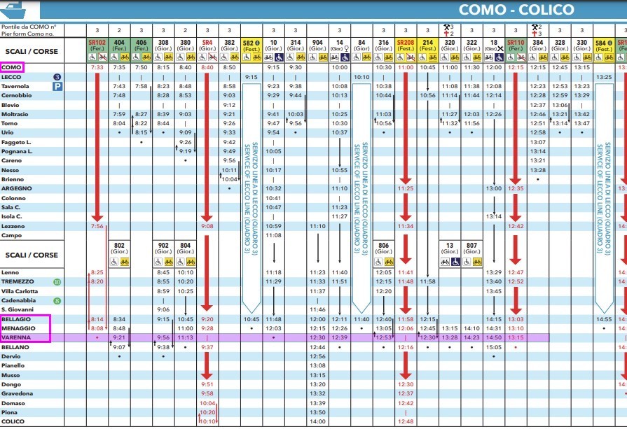 Vous avez aussi quelques Speed Boat que vous pouvez repérer avec les grosses flèches rouge. Par exemple vous avez un speed boat qui part de Côme à 12h15 et arrive à Varenna 13h15. Vous en avez un aussi qui part à 8h40 et arrive à Bellagio à 9h20 ou 9h28 à Menaggio, et de là il faudra reprendre un bateau pour Varenna… Bref c’est plus compliqué comme vous commencez à le comprendre.